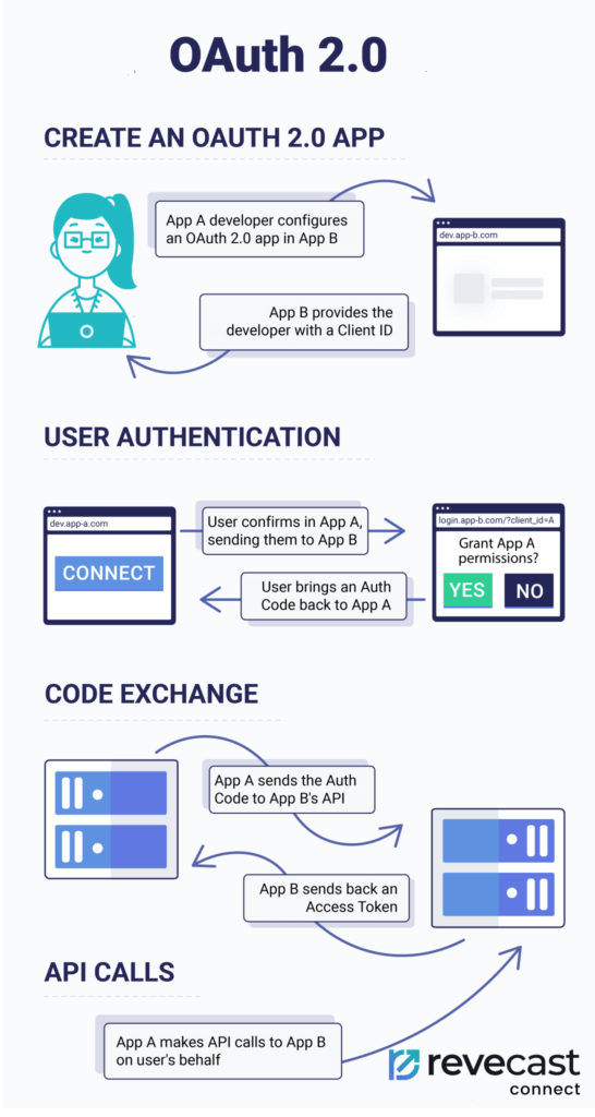 | OAuth 2.0 | Open Authorization 2.0 is an authorization mechanism commonly used in integrations. Customers click a “connect” button within your configuration wizard and consent to allowing your app to access their data in a third-party app. Visit our article, 9 Ways to Build Secure Salesforce Integrations | Example: Clicking “connect” in the configuration wizard to authorize Revecast Connect to access data from your Google account using OAuth 2.0. |
