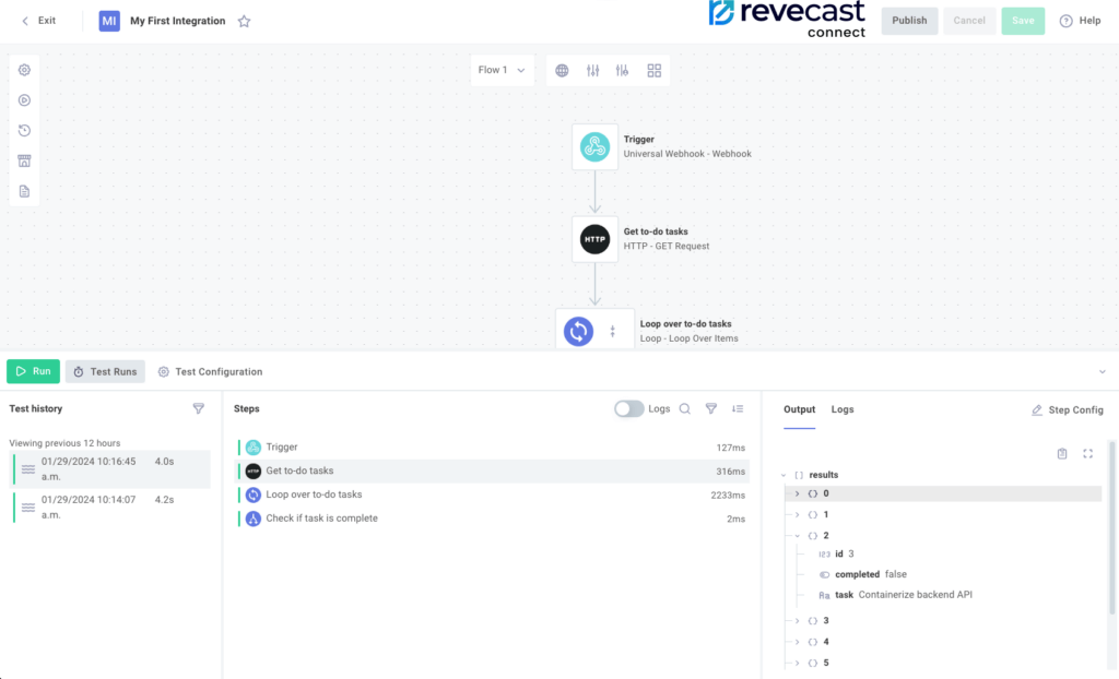 Welcome to the Revecast Connect Test Integrations guide. Ensuring your integrations work flawlessly before deploying them is crucial for smooth operations. This page outlines best practices for testing integrations using our integration designer’s sandbox environment. Here, you can invoke test instances, configure test values, and view real-time logs.